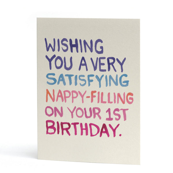 Nappy Filling First Birthday Card - illustrated by Claire Senior as part of the Experi-mental Pancake Zone Wishing you a very satisfying nappy-fill...