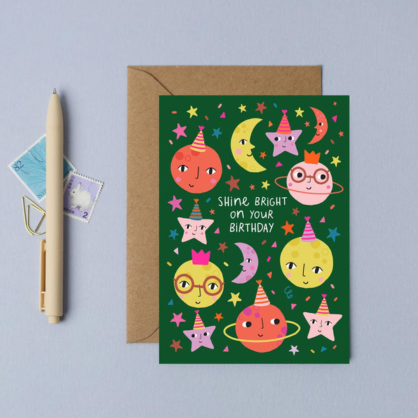 Space Gold Foil Birthday Card illustrated by Natalie Alex aka Mifkins "Hope Your Birthday is out of this World" says the gold foil text on this pla...