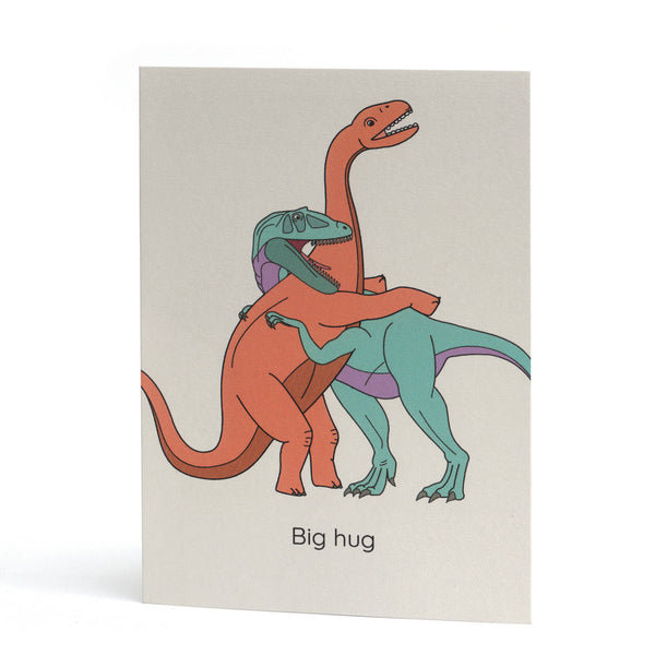 Big Hug Dinosaur Card illustrated by Charlotte at Dinosaurs Doing Stuff Featuring a Fukuiraptor 'hugging' a Jobaria. Is it a hug or is it a fight t...