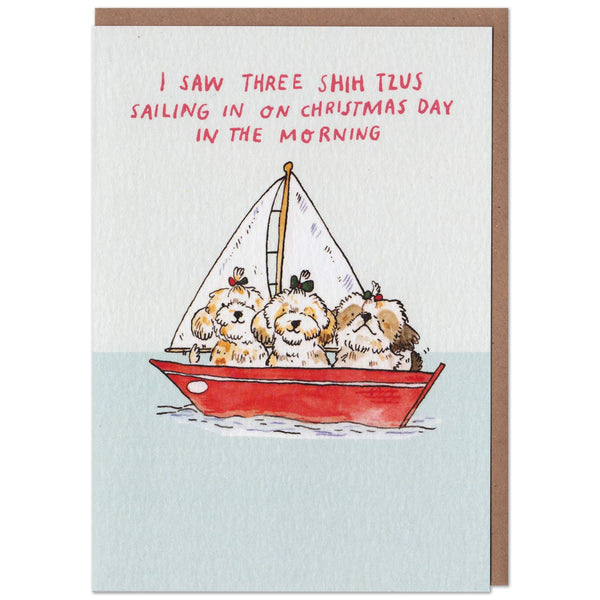 I Saw Three Shih Tzus Sailing In Christmas Card illustrated by Jelly Armchair I Saw Three Ships is the traditional Christmas carol this dog-pun Chr...