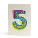 This colourful numero 5-o birthday card is printed in the UK onto 350gsm luxury matt FSC board. It comes with a light grey envelope.
