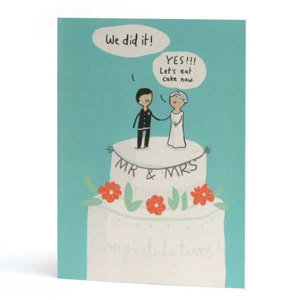 Mr and Mrs Wedding Day Greeting Card - illustrated by Sarah RayThis newly married wedding topper couple have differing priorities... we have to say...