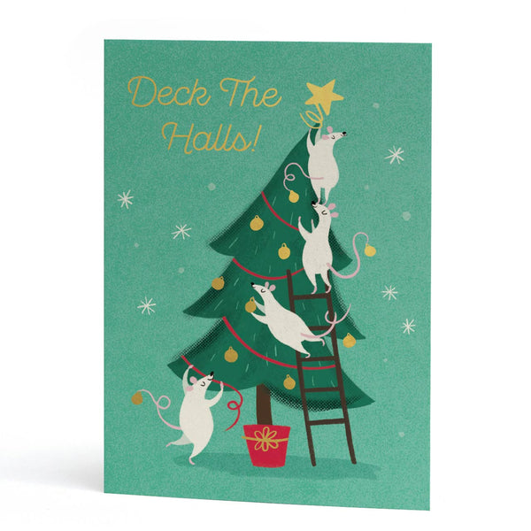 Deck The Halls Gold Foil Christmas Card - illustrated by Stormy KnightFour white mice decorate a Christmas tree in this lovely, festive Christmas c...