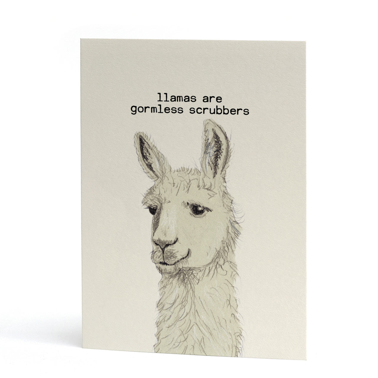 Llamas are Gormless Scrubbers Card - part of the Overrated Animals range illustrated by Claire Senior at The Curious Pancake