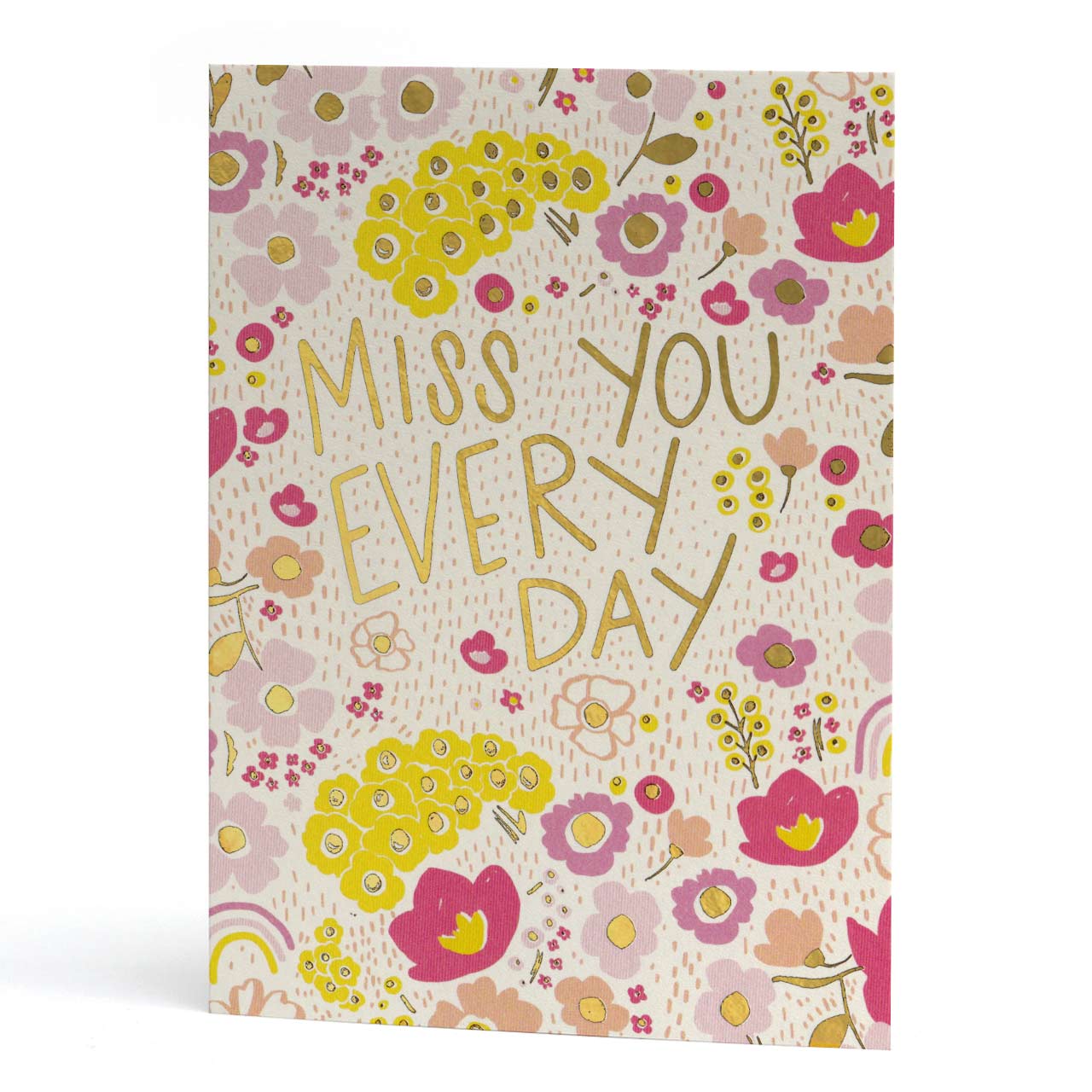 This brightly coloured, floral greeting card is sure to raise a smile from that special someone who's in your life but far away! Show them you're missing them with this special, gold foil accented greeting card.