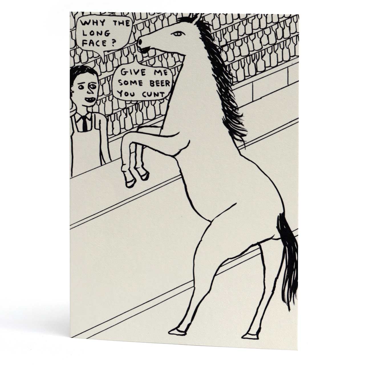 Why the long face? Well, it's certainly not the punchline this bar-tender was expecting!! If you love the original horsing around of David Shrigley as much as we do, along with unexpected swearing, then this card is definitely for you... or a friend with a similar funny bone!